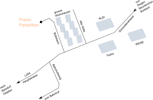 nach rechts in die Straße "Bollnbach" ein. Vom Bahnhof Herdorf sowie den Bushaltestellen Hauptstraße / Rathaus, Schneiderstraße / Grundschule / REWE-Markt ist unsere Praxis innerhalb von ca. 5-10 Minuten auf dem Fußweg erreichbar. | ![]() |
